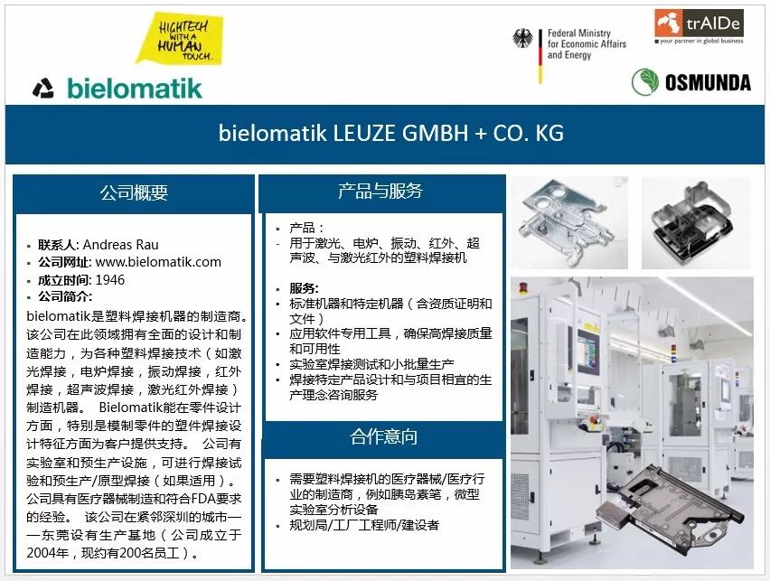 bielomatik是塑料焊接机器的制造商。 该公司在此领域拥有全面的设计和制造能力,为各种塑料焊接技术(如激光焊接,电炉焊接,振动焊接,红外焊接,超声波焊接,激光红外焊接)制造机器。 Bielomatik能在零件设计方面,特别是模制零件的塑件焊接设计特征方面为客户提供支持。 公司有实验室和预生产设施,可进行焊接试验和预生产/原型焊接(如果适用)。 公司具有医疗器械制造和符合FDA要求的经验。 该公司在紧邻深圳的城市——东莞设有生产基地(公司成立于2004年,现约有200名员工)。 bielomatik is a manufacturer for plastic welding machines. The company has full design and manufacturing/building capabilities in this field. They build machines for all kind of plastic welding technologies, such as Laser welding, Hotplate Welding, Vibration Welding, Infrared Welding, Ultrasonic Welding, Laserbased Infrared Welding. Bielomatik can support the customer in parts design and especially in plastic welding design features for the moulded parts. They have laboratory and pre-production facilities allowing to carry out welding trials and pre-production/prototype welding if applicable. The company has experience with medical machine building and FDA requirements. They have a manufacturing site in Dongguan (approx. 200 emloyees, founded in 2004), close to Shenzhen. 产品Products -用于激光、电炉、振动、红外、超声波、与激光红外的塑料焊接机 Plastic Welding Machines for: Laser, Hotplate, Vibration, Infrared, Ultrasonic, Laserbased Infrared 服务Services: -标准机器和特定机器(含资质证明和文件)Standard- and special machines incl. qualification and documentation -应用软件专用工具,确保高焊接质量和可用性Application specific tools that ensures high welding quality and availability -实验室焊接测试和小批量生产Laboratory for test welding and small serial production -焊接特定产品设计和与项目相宜的生产理念咨询服务Consulting on welding specific product design and project appropriate production concepts