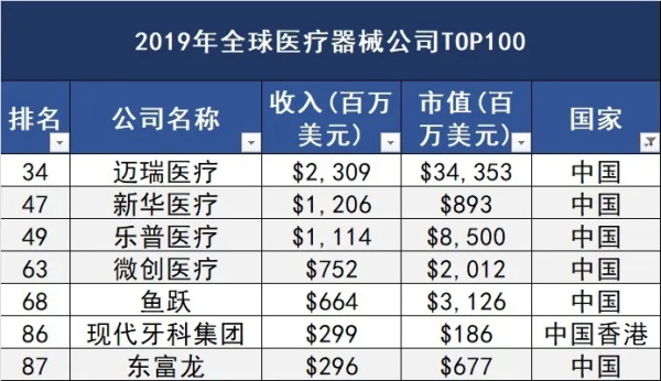 ↓最新2019年医疗器械公司TOP100排名情况↓(收入单位:百万美元)