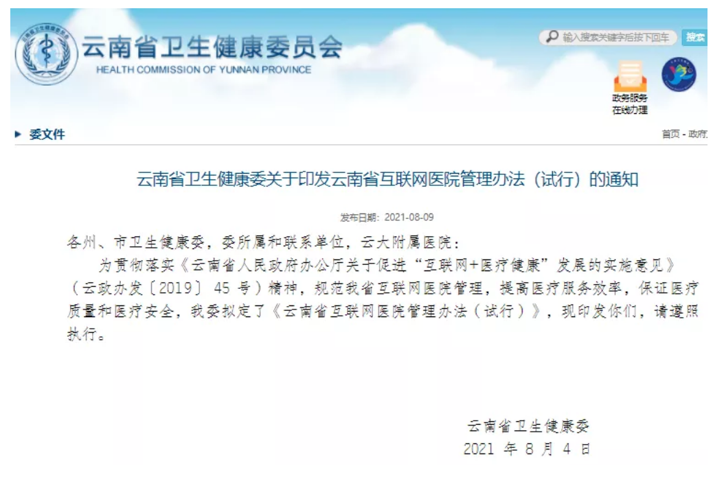 为规范全省互联网医院管理,提高医疗服务效率,保证医疗质量和医疗安全,省卫生健康委于近日发布《云南省互联网医院管理办法(试行)》,明确了省内互联网医院的设置审批、执业及监督管理等工作要求,自2021年9月6日起施行。