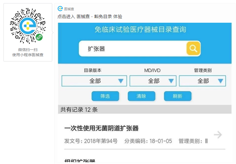 例如 : 输入“扩张器”,可以在免临床目录里找到所有名称里包含有“扩张器”的医疗器械。
